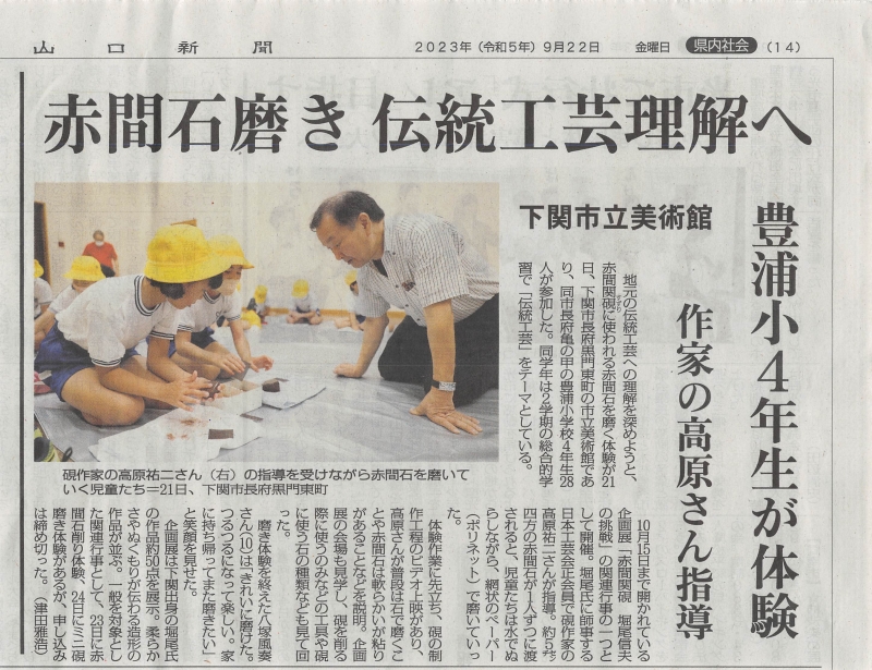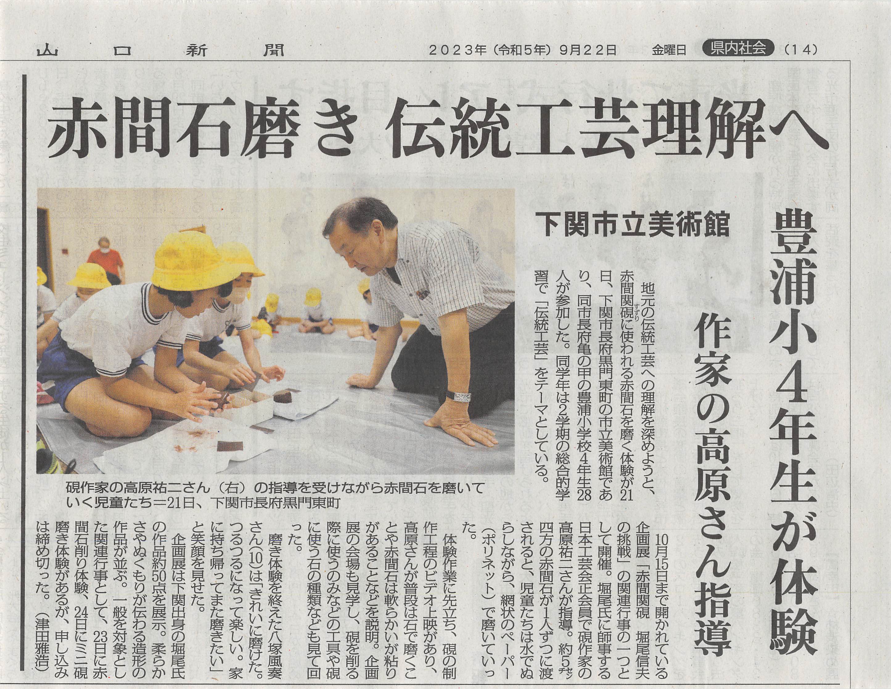 山口新聞に「赤間石磨き 伝統工芸理解へ」の記事が掲載されました 2023.09.22 9月20日から28日にかけて、豊浦小学校と名陵小学校の4年生が、赤間関硯の鑑賞と硯の石材である赤間石を磨く体験をしています。 磨くにつれて、ざらざらした表面がつるつるに変化していく様子を楽しんでいました。 Category:玉弘堂からのお知らせ Author:玉弘堂 /blog/blog_comments/captcha/74272415 /blog/blog_comments/get_token