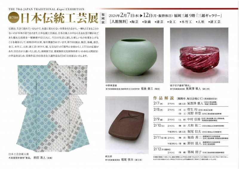 第70回日本伝統工芸展(福岡巡回展)のご案内(終了しました) 2024.02.13 第70回日本伝統工芸展(福岡巡回展)が、2月7日(水)から2月12日(月)まで、福岡三越9階「三越ギャラリー」にて開催されます。 玉弘堂からは、堀尾信夫作「峡文研」、髙原祐二作「すみすり『海峡』」、中村一姫作「種子研」が出展されます。 中村一姫は、日本伝統工芸展初入選です。本展の歴史の中で、女性の硯作家が入選したのは、初めてのことです。 なお、2月10日(土)午後3時から堀尾信夫が諸工芸部門の作品解説を行います。ご高覧いただけると幸いです。 中村一姫作 種子研 Category:玉弘堂からのお知らせ タグ:赤間関硯 , 日本伝統工芸展 Author:玉弘堂 /blog/blog_comments/captcha/48351181 /blog/blog_comments/get_token