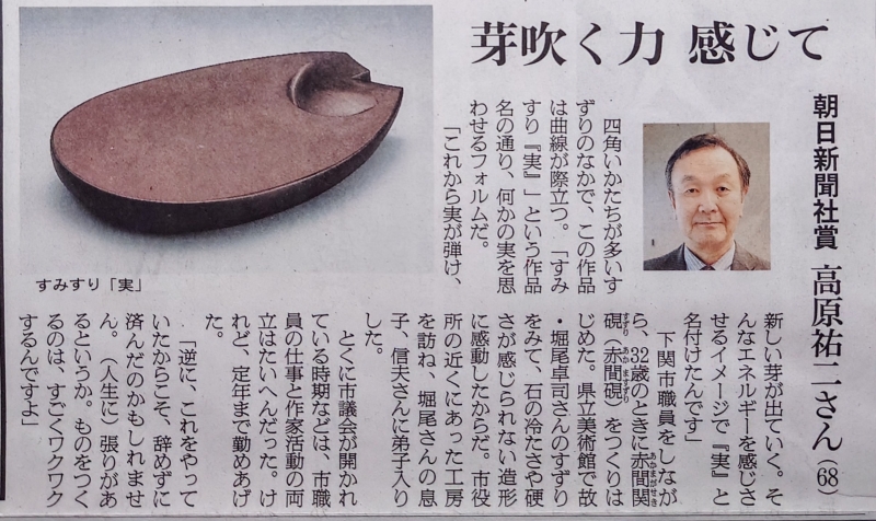 朝日新聞に髙原祐二の記事が掲載されました 2025.04.10 4月13日まで山口県立萩美術館・浦上記念館で開催されている第48回山口伝統工芸展。 朝日新聞社賞を受賞した髙原祐二の記事が、4月10日の朝日新聞(山口版)に掲載されました。 朝日新聞山口版(令和7年4月10日) Category:玉弘堂からのお知らせ タグ:赤間関硯 , 山口伝統工芸展 Author:玉弘堂 /blog/blog_comments/captcha/49446237 /blog/blog_comments/get_token